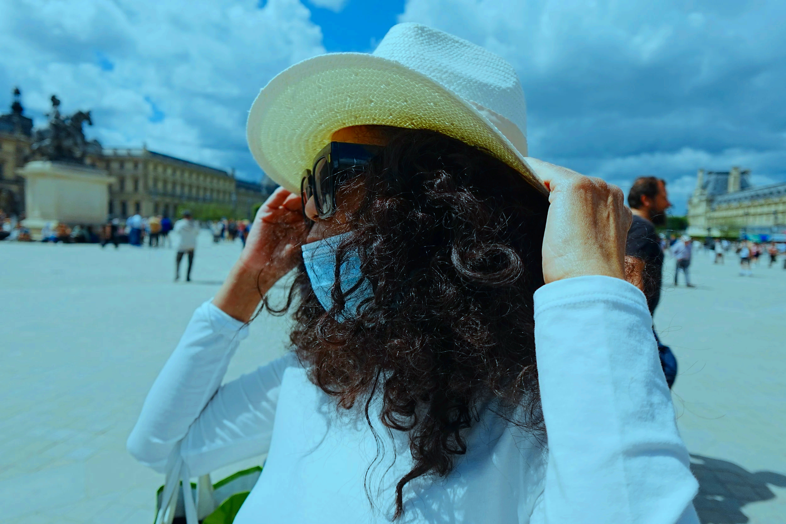 A masked woman stands before the Louvre Museum in Paris, reflecting the resilience of a world changed yet enduring. In the presence of timeless art, even uncertainty becomes a quiet act of hope.
